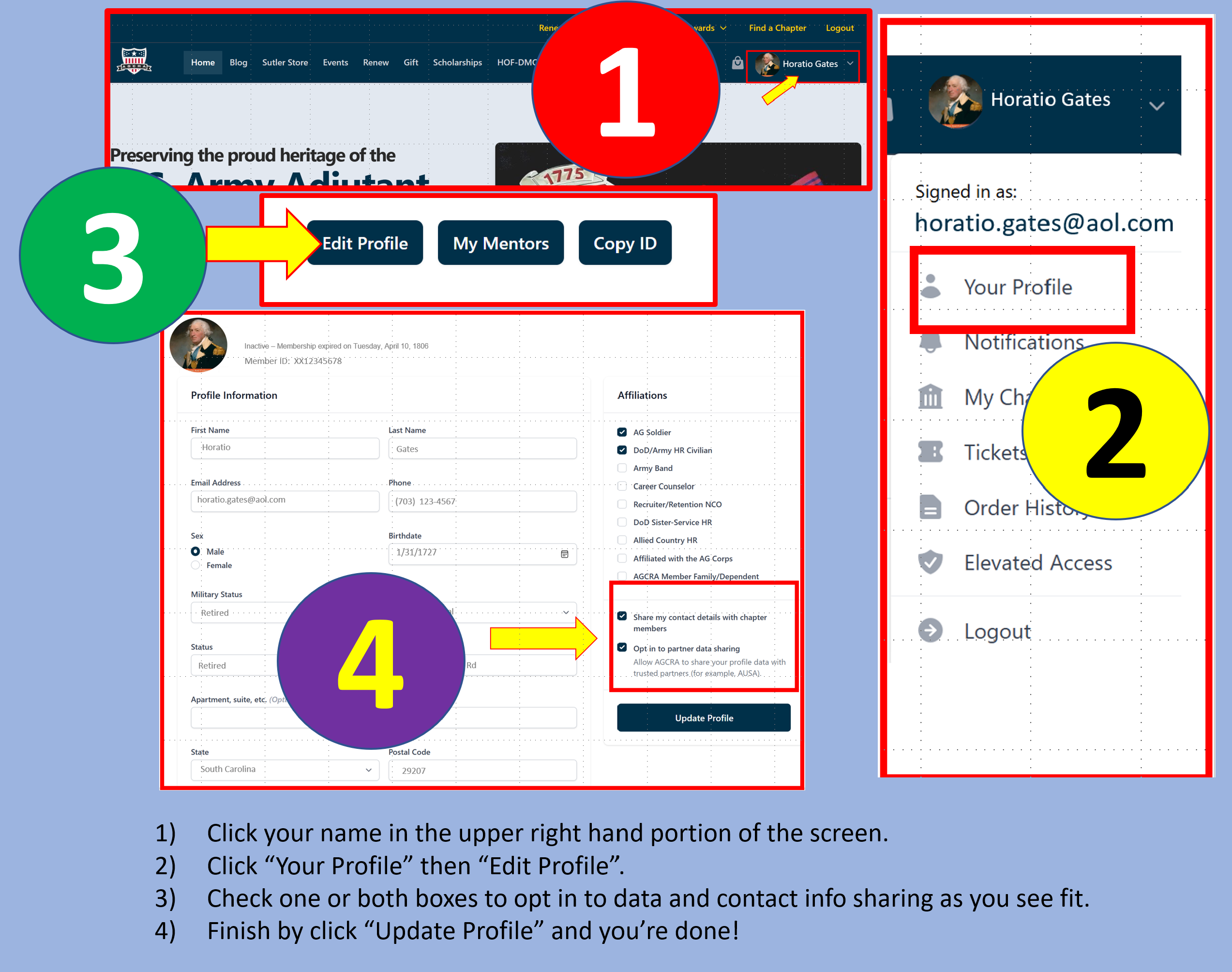 Both settings are entirely optional and can be updated at any time by logging into your member profile at www.agcra.com and following the step-by-step instructions provided in the attached graphics.